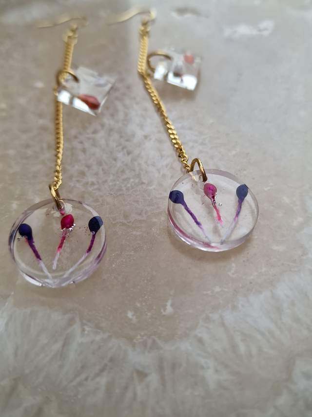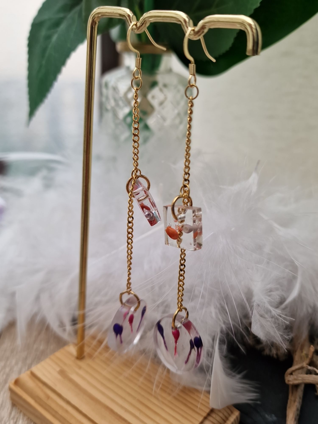 Boucles D'oreilles Acier Doré Résine Fleurs Séchées Multicolore