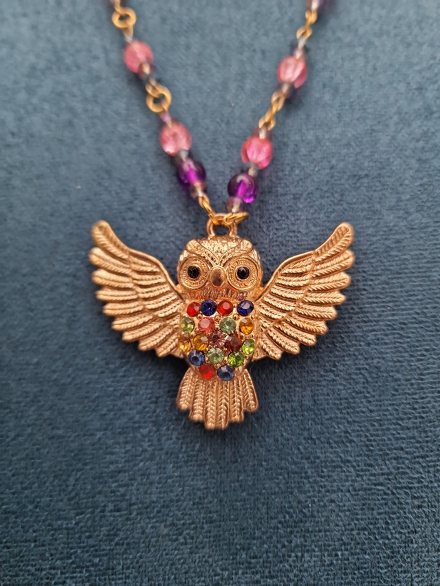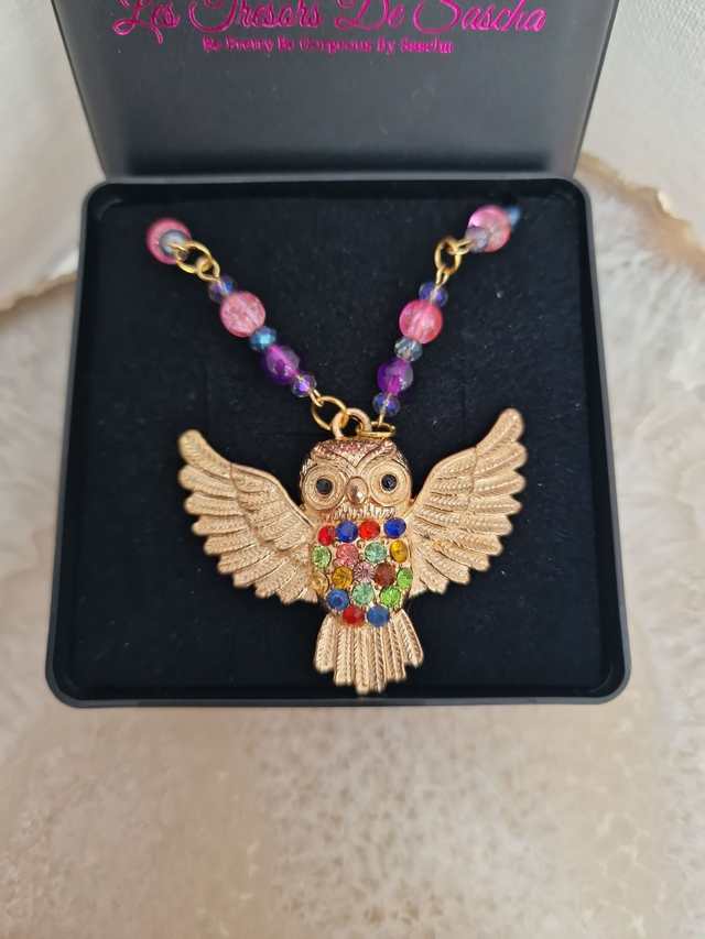 Collier Acier Doré, Chouette Email Ornée De Strass Multicolore et Perles De Verre Et De Cristal.