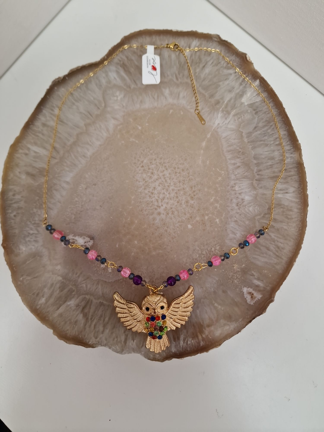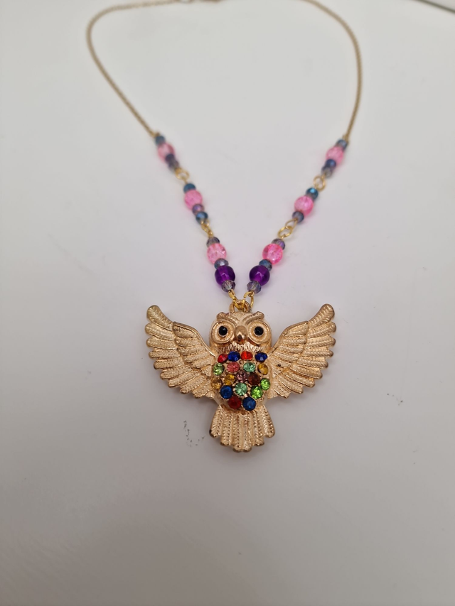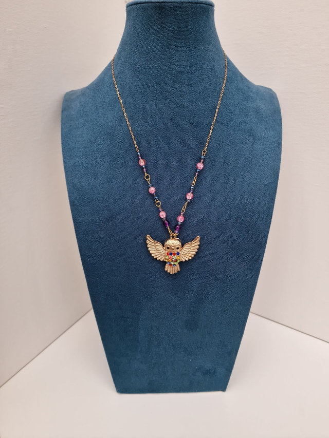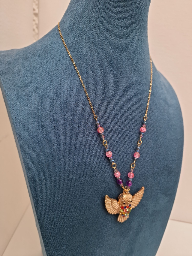 Collier Acier Doré Chouette Strass Multicolore Perles