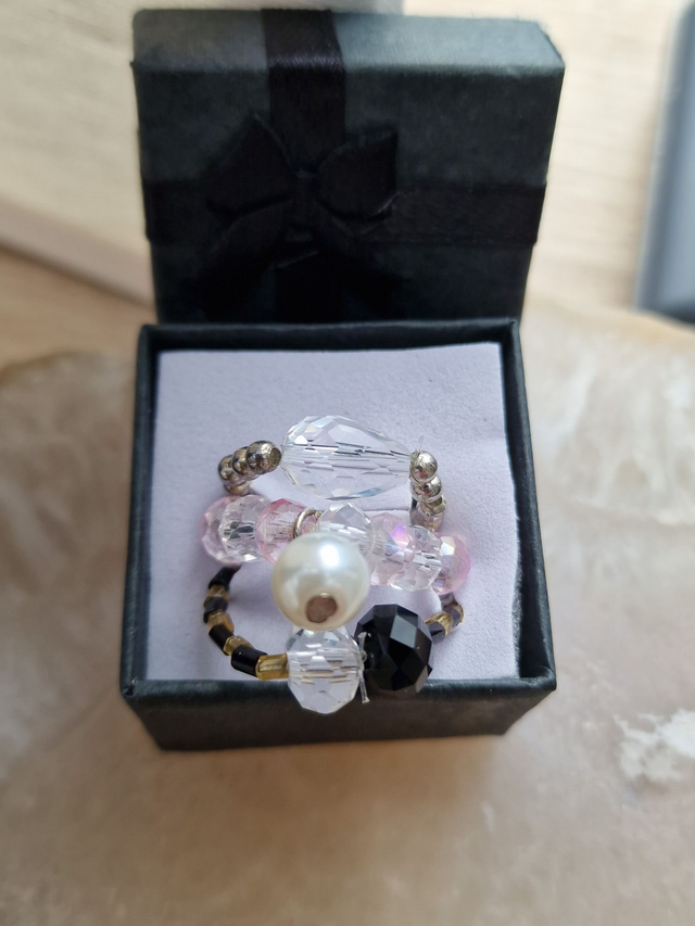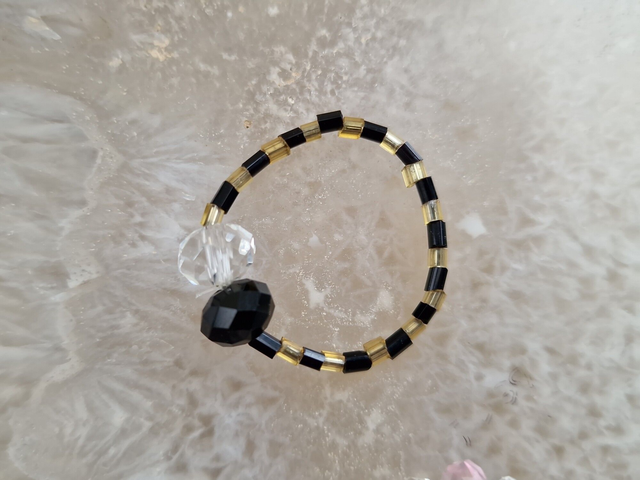 -1 Bague nylon perles racailles dorées et noires et perle cristal noir et transparent