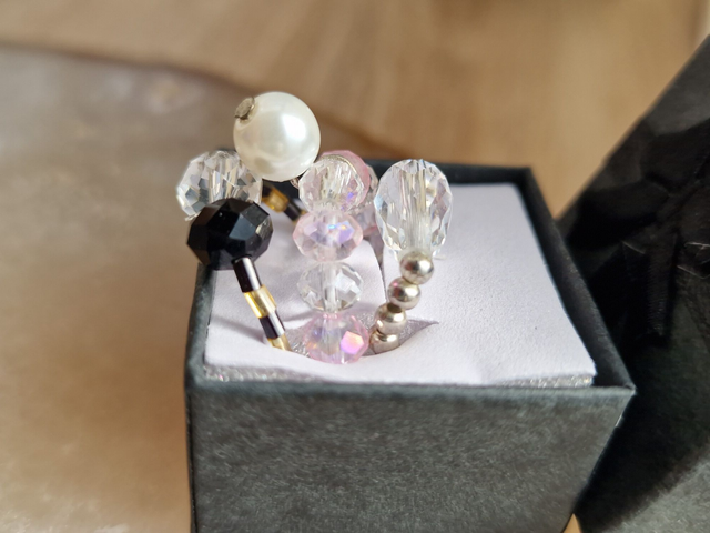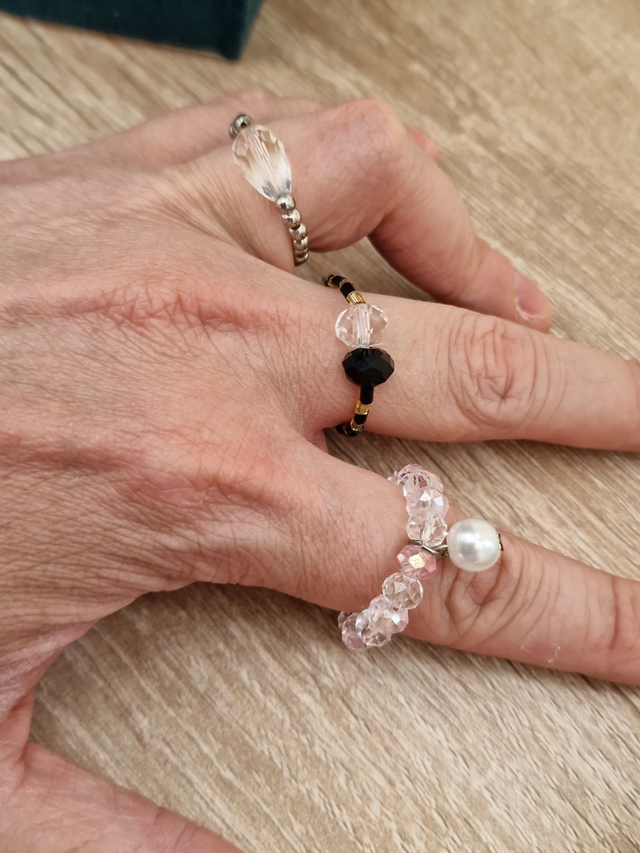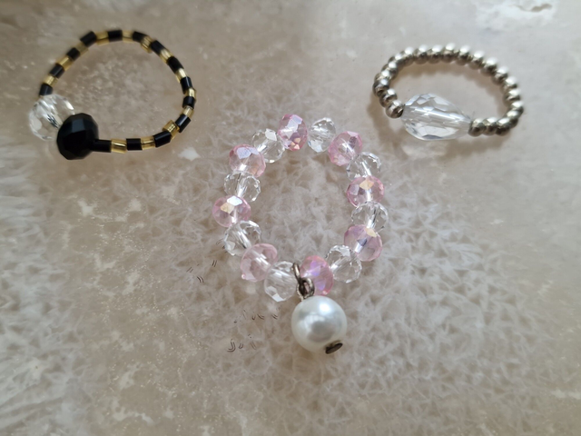 Lot de 3 bagues nylon avec des rocailles, des perles a facettes et des perles de cristal.