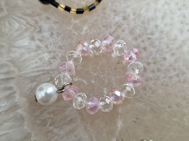 -1 Bague nylon avec perles a facettes rose, perle de cristal blanc transparent et une grosse perle nacré blanche