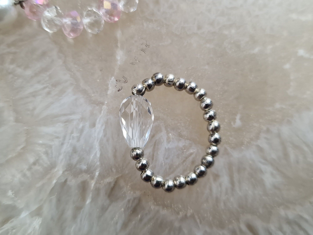 -1 Bague nylon perles en metal argentées et perle goutte en cristal