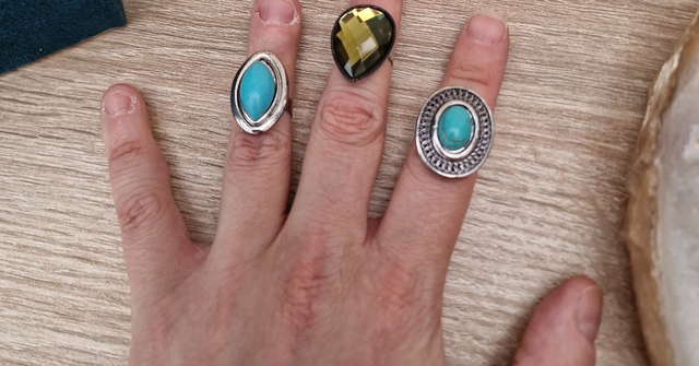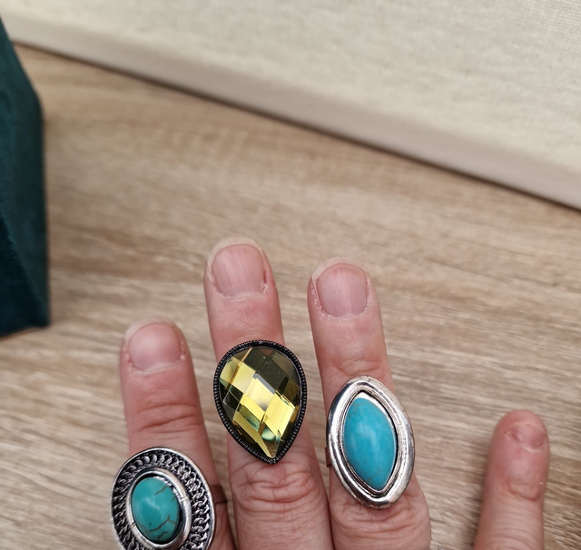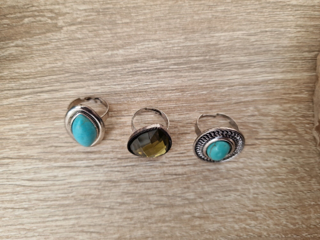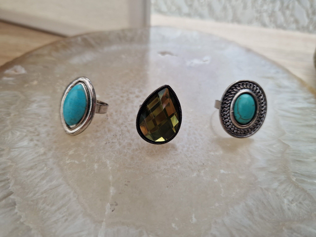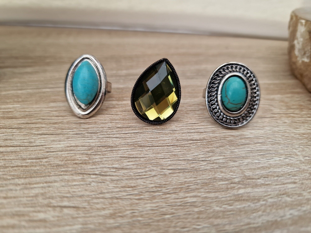 Lot de 3 bagues réglables en métal argenté avec pierre turquoise et l'autre avec un grand strass en forme de goutte.